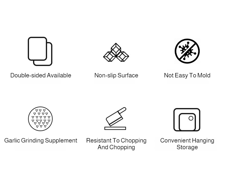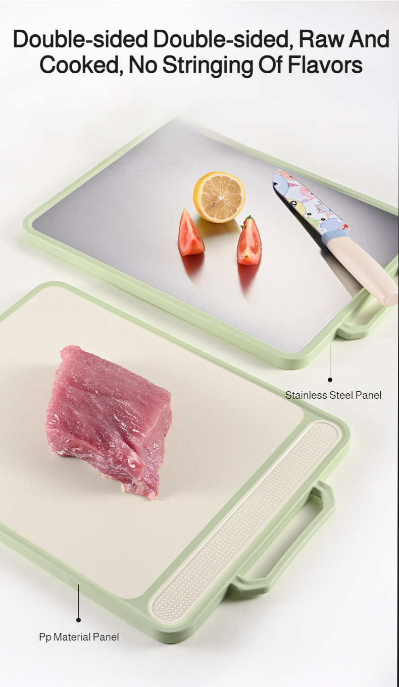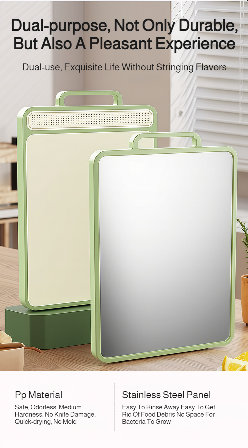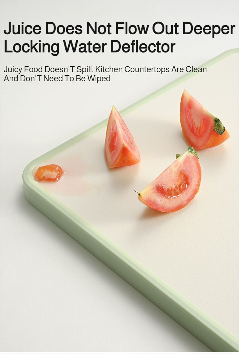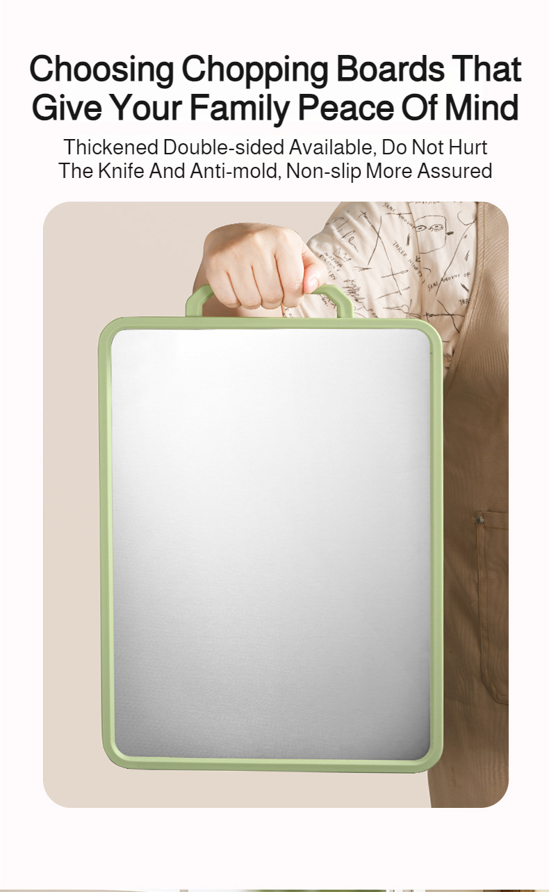 Thickened antibacterial double-sided cutting board with durable, food-grade material. Features non-slip edges, easy-to-clean surfaces, and separate sides for meat and vegetables. Suitable for daily kitchen use.